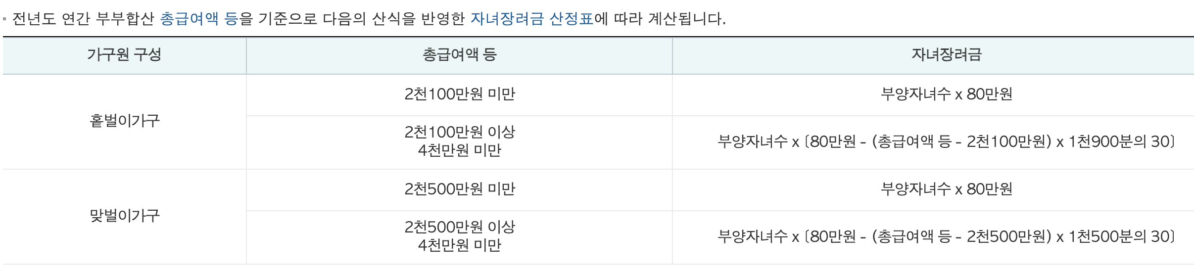 자녀양육을 지원하기 위해서 총소득(부부합산) 4천만 원 미만이면서 부양자녀(18세 미만)가 있는 경우 1명당 최대 80만 원을 지급하는 제도입니다.