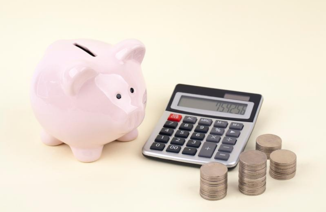 돼지저금통과 계산기나무 조각 두개가 놓여있다.