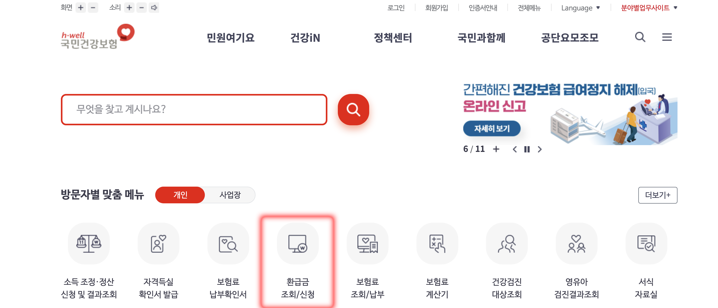 1. 국민건강보험공단 홈페이지에 접속 후 환급금 조회/ 신청을 클릭해 줍니다.
